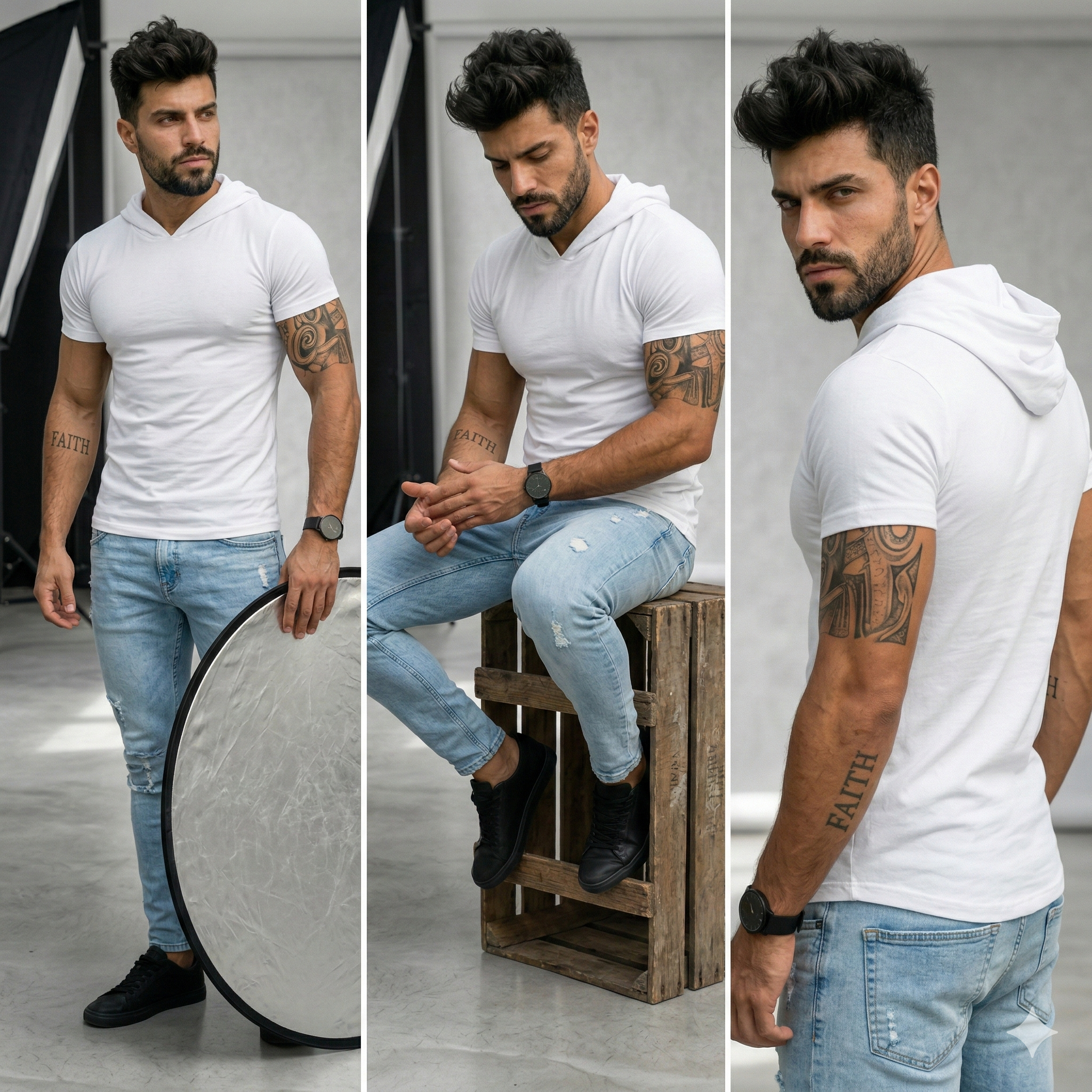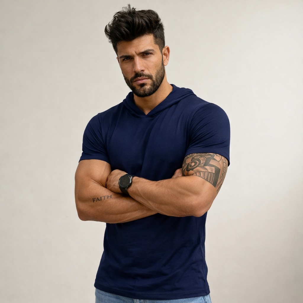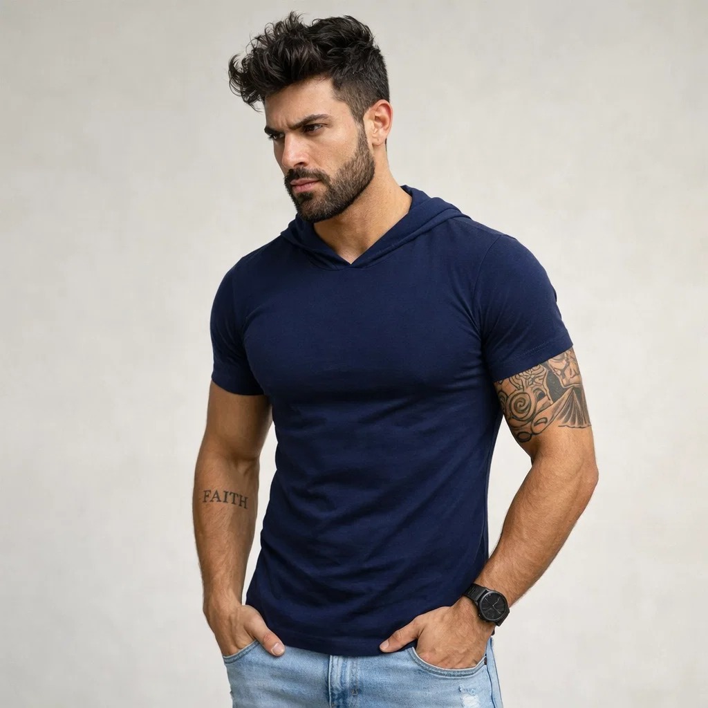O tecido também oferece uma excelente respirabilidade, proporcionando uma sensação fresca e agradável ao vestir. A camiseta é projetada para se ajustar confortavelmente ao corpo masculino, sem ser muito apertada ou larga. O capuz é uma opção prática para proteger do sol ou da chuva leve. Esta camiseta pode ser usada em diversas ocasiões, desde uma caminhada no parque até um encontro informal.